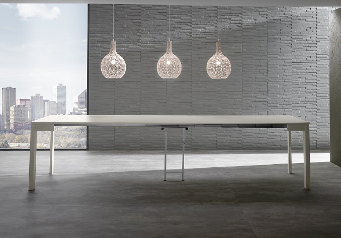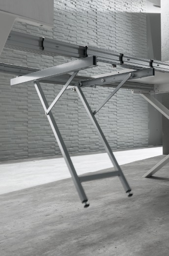 struttura metallo laccato, dotata di guida telescopica in alluminio e supporto centrale ad estrazione automatica; piana ed allunghe in melaminico