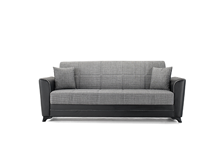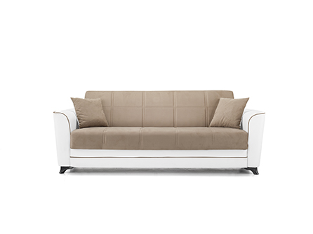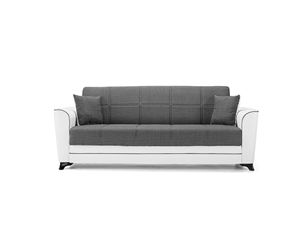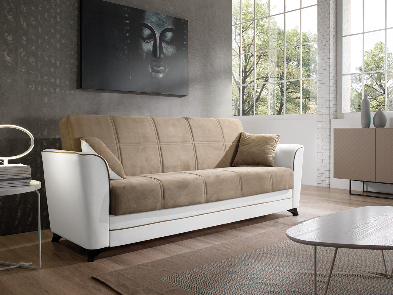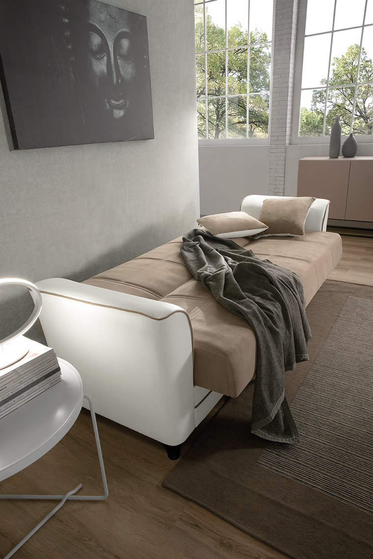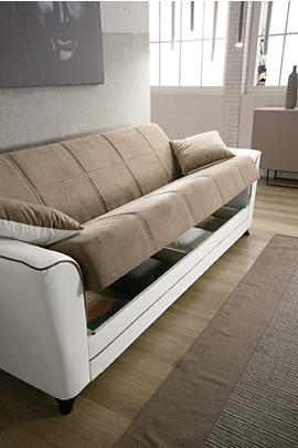 Divano prontoletto in ecopelle e tessuto, con contenitore. Disponibile in diversi colori.