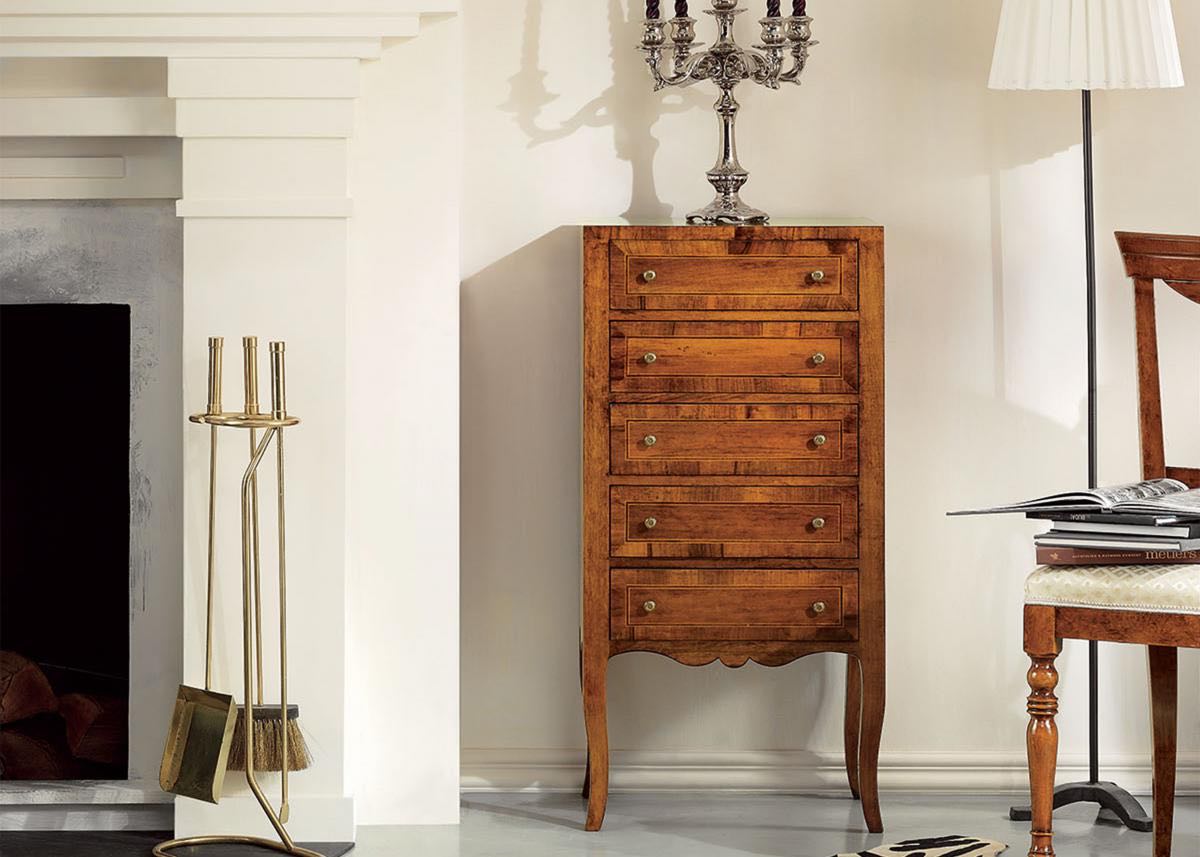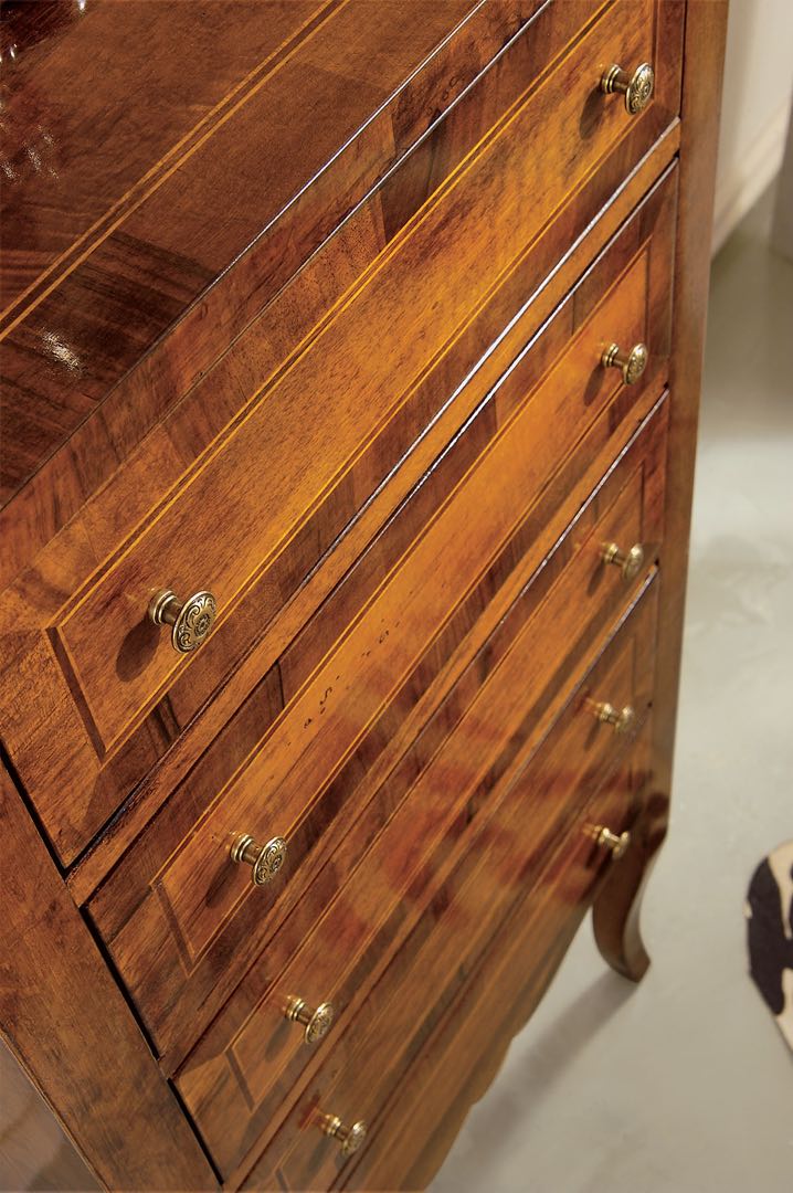 Descrizione Cassettiera lastronata in noce con cinque cassetti