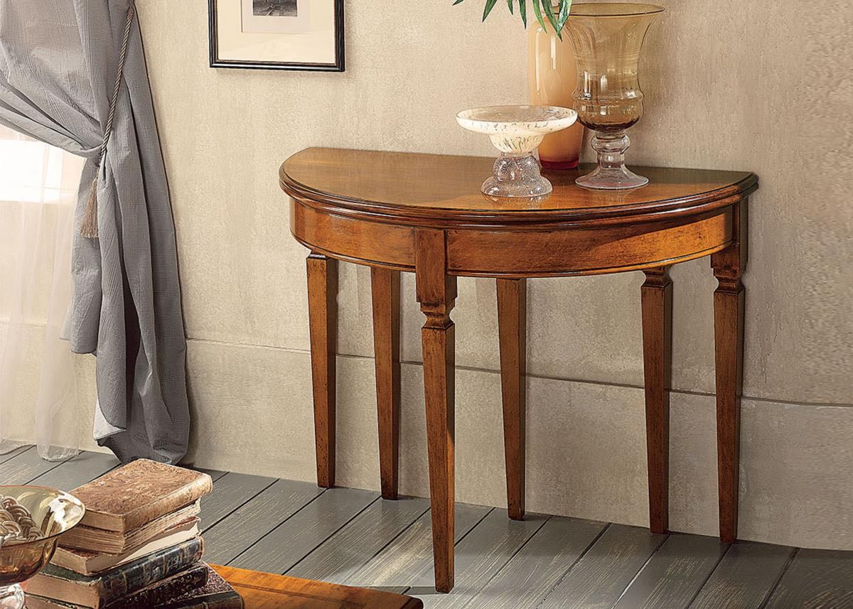 Descrizione Consolle mezzaluna allungabile con tre allunghe esterne da cm.40, piede a spillo