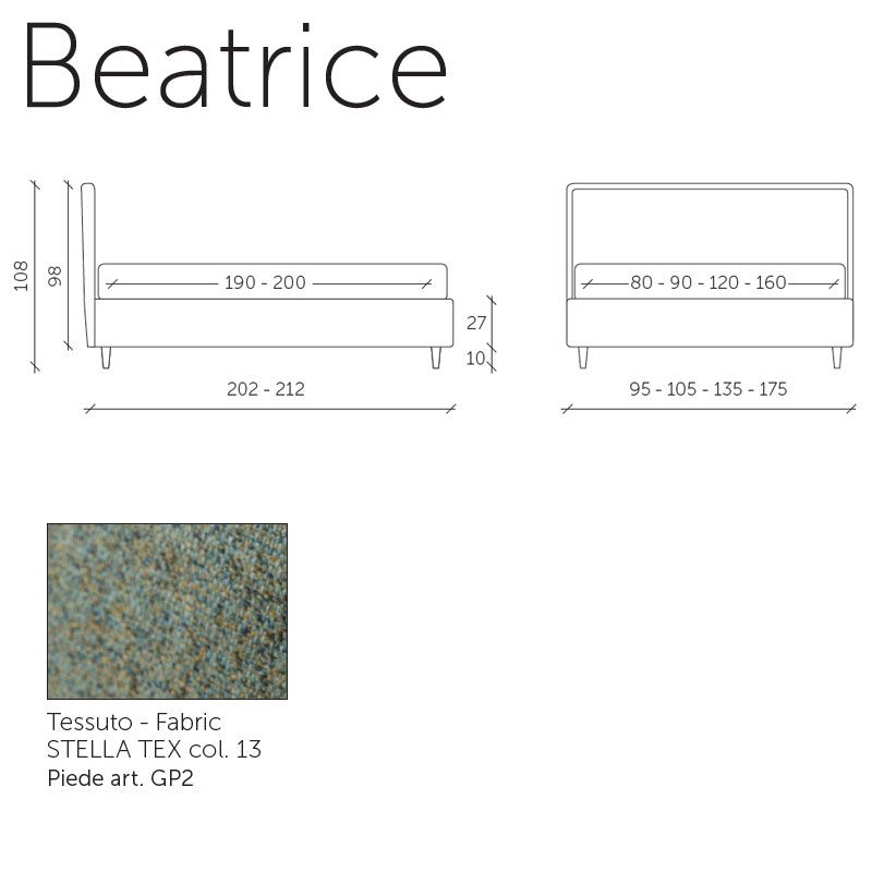 È un letto dal design semplice e funzionale che si integra perfettamente negli ambienti-notte dal gusto moderno. Beatrice si definisce un “salvaspazio” in quanto la sua profondità complessiva di 202 cm. con rete da 190, risulta essere estremamente contenuta, e permette di ottimizzare e sfruttare al massimo gli spazi nella stanza. La testata si caratterizza per la balza perimetrale che la rende elegante e raffinata e può essere realizzata in tessuto o pelle ecologica scelti fra i tantissimi materiali disponibili nel vasto campionario.