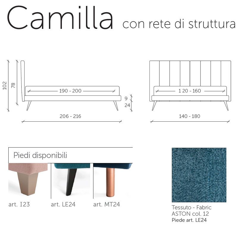 Camilla con rete di struttura ha la rete ortopedica integrata nel giroletto e può essere realizzata di serie in versione matrimoniale da 160 o 120 e con rivestimento giroletto e testata sfoderabile. Gli innesti allungabili fino a 10 cm, presenti tra rete e testata, permettono l’utilizzo di materassi con profondità da 190 cm a 200 cm (nella versione con rete da 190) e materassi con profondità da 200 cm a 210 cm (nella versione con rete da 200).