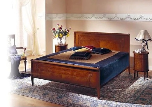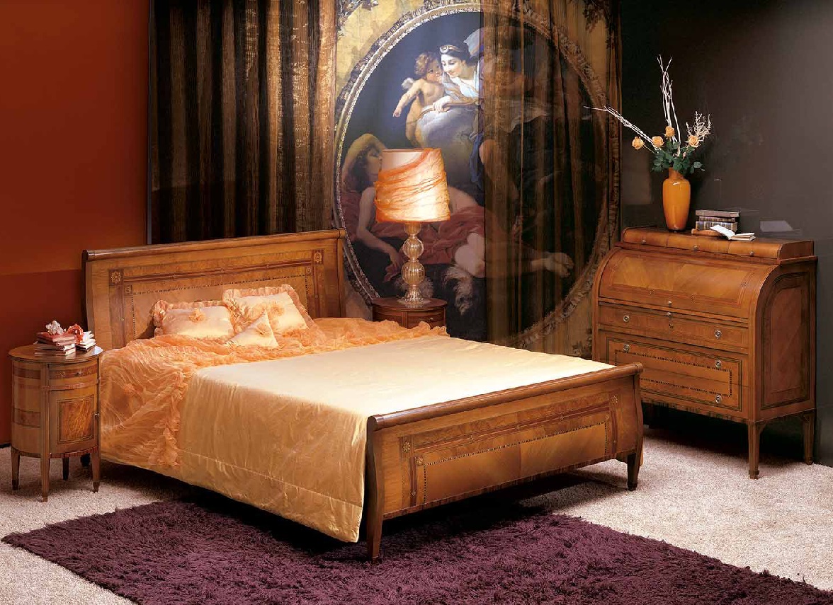 noce e mogano che terminano agli angoli con tableaux intarsiati a foglia. Dimensioni: cm 174x205x110 h esterna.