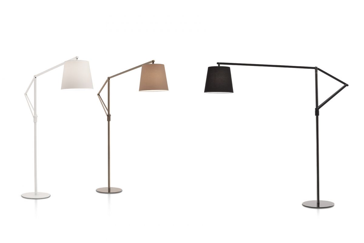 Lampada da terra composta da base e asta in Acciaio laccato e braccio orientabile in alluminio laccato regolabile. Paralume in tessuto.