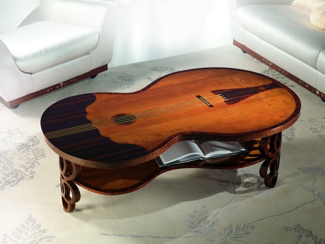 La linea richiama la forma di un contrabbasso; il piano è in ebano e piuma di cerejeira con inserti in ottone che ricordano le “corde” dello strumento. Lo spessore del piano ha un’importante filettatura in palissandro. In palissandro anche le tre gambe di appoggio, caratterizzate da una lavorazione ad anelli bombati.