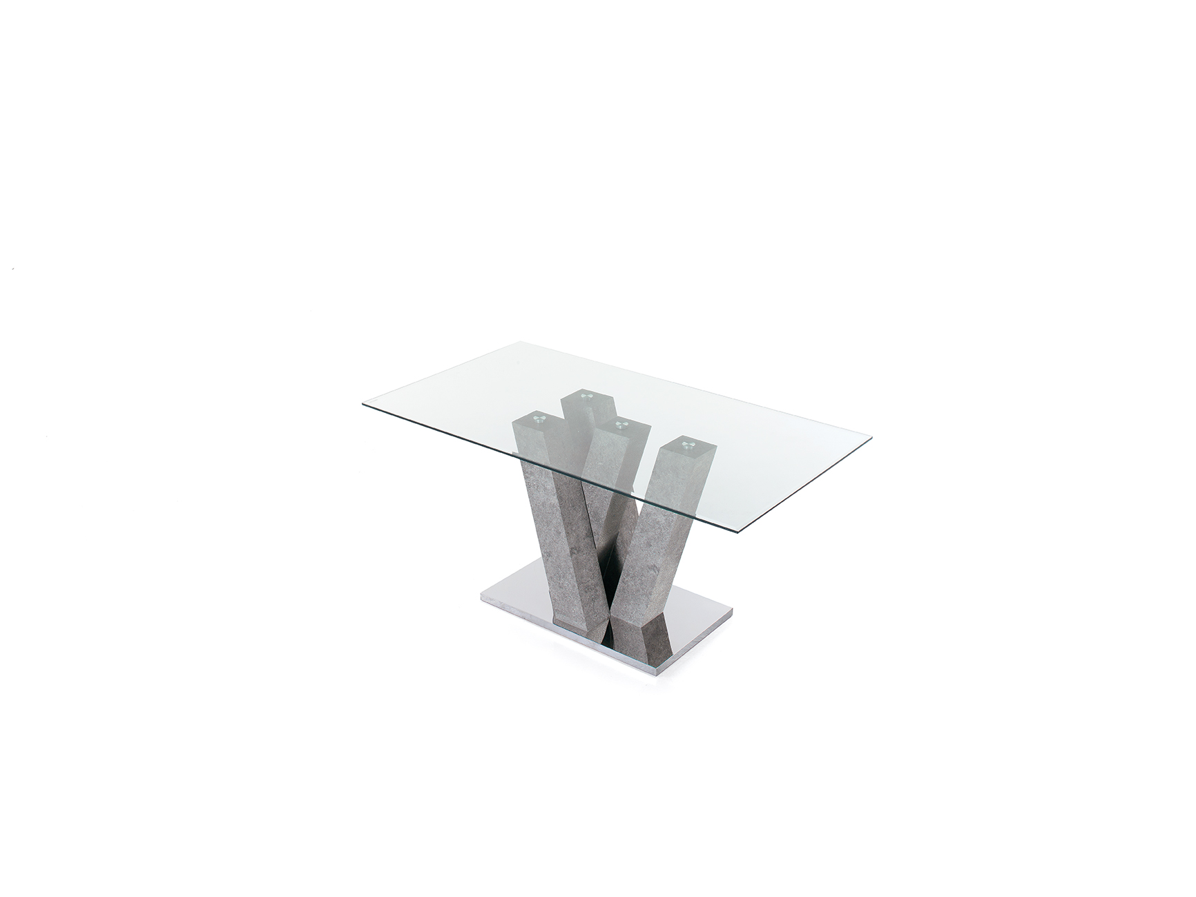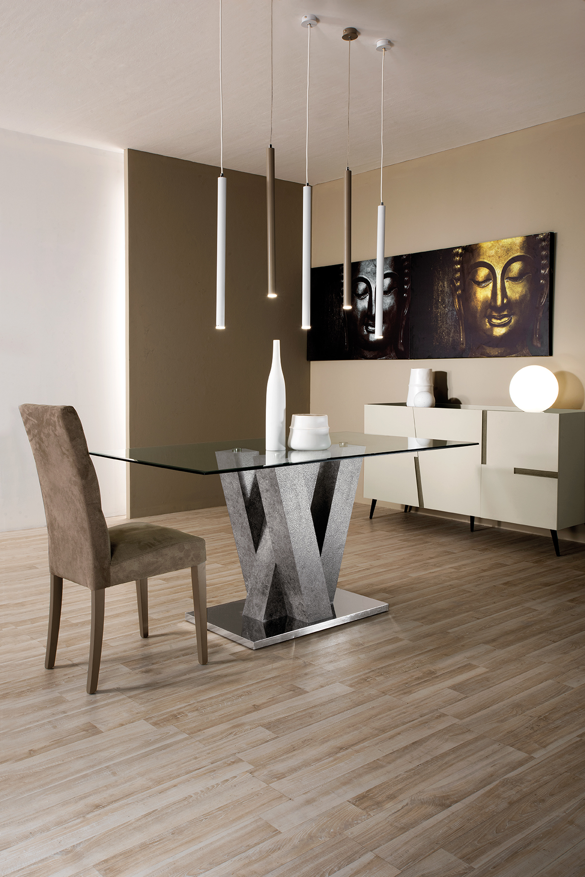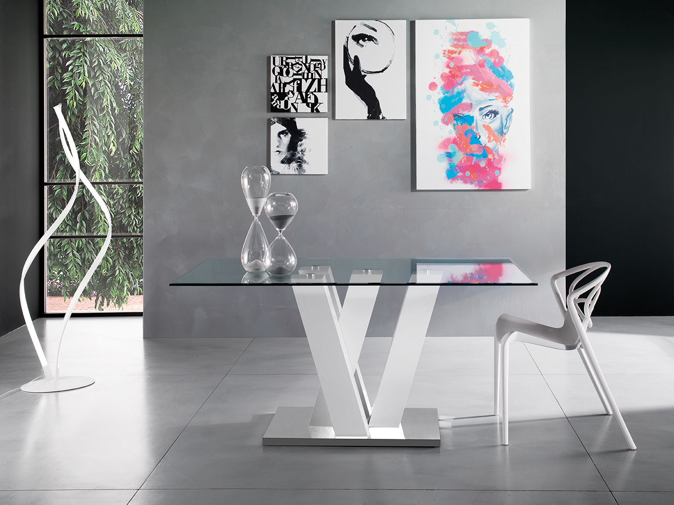Tavolo con appoggio in metallo cromato e piano in vetro. Disponibile in diversi colori.