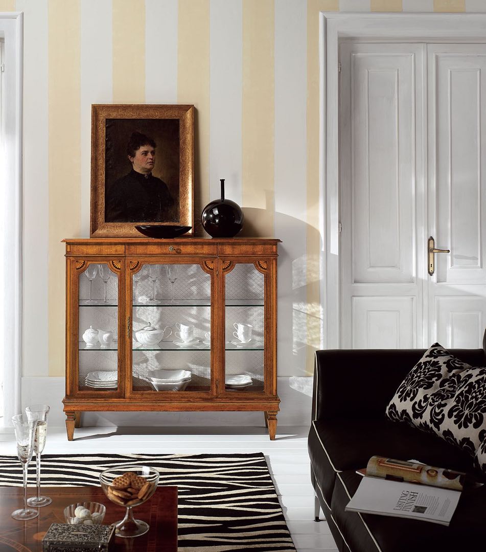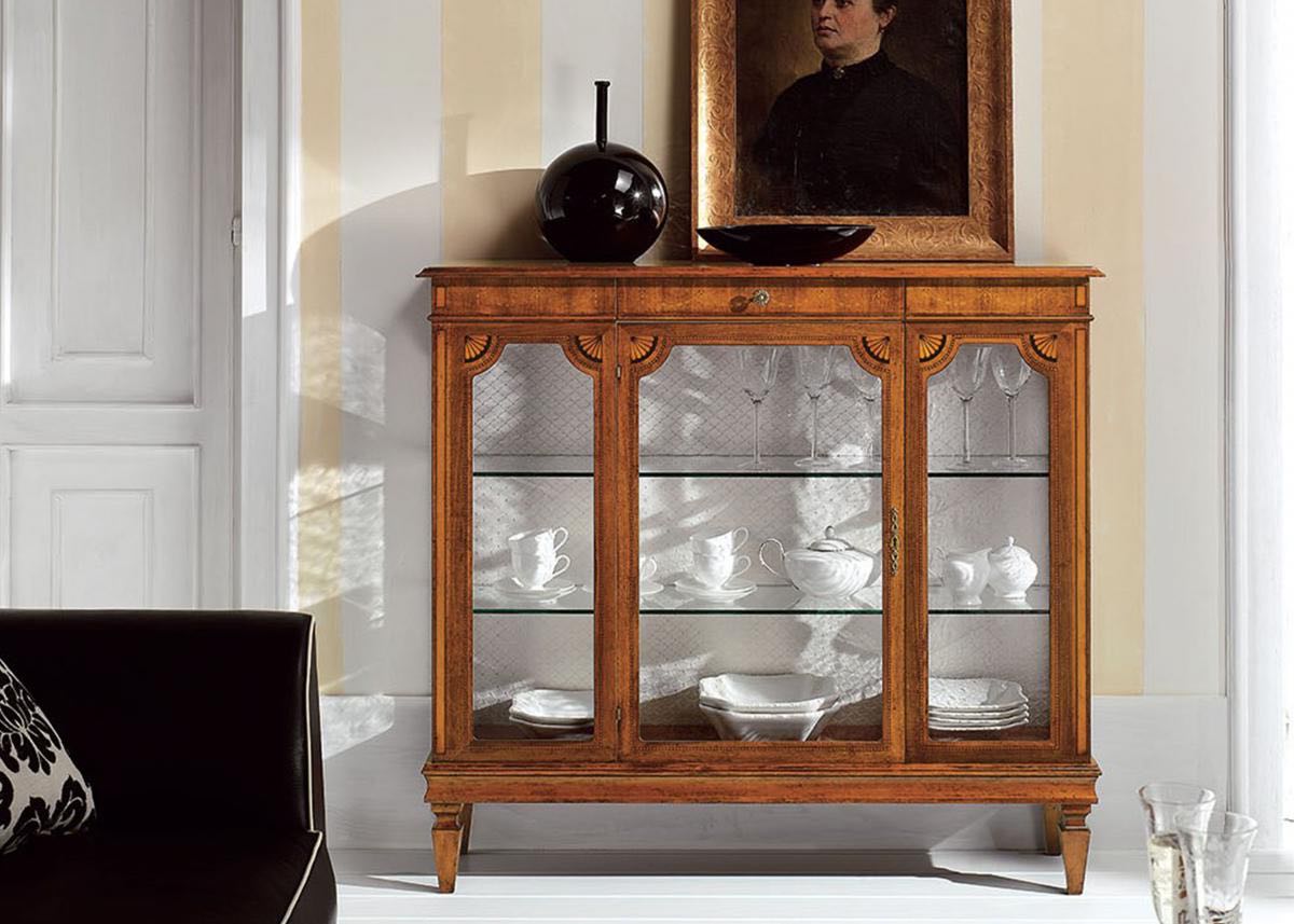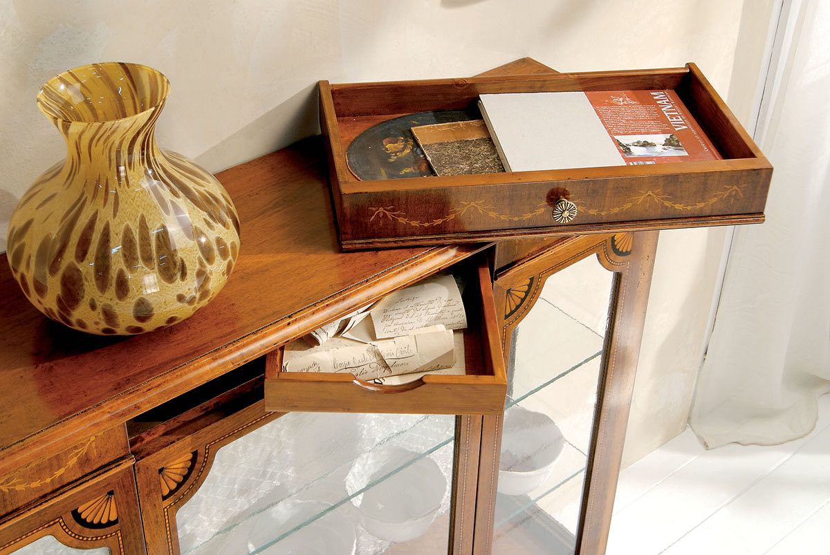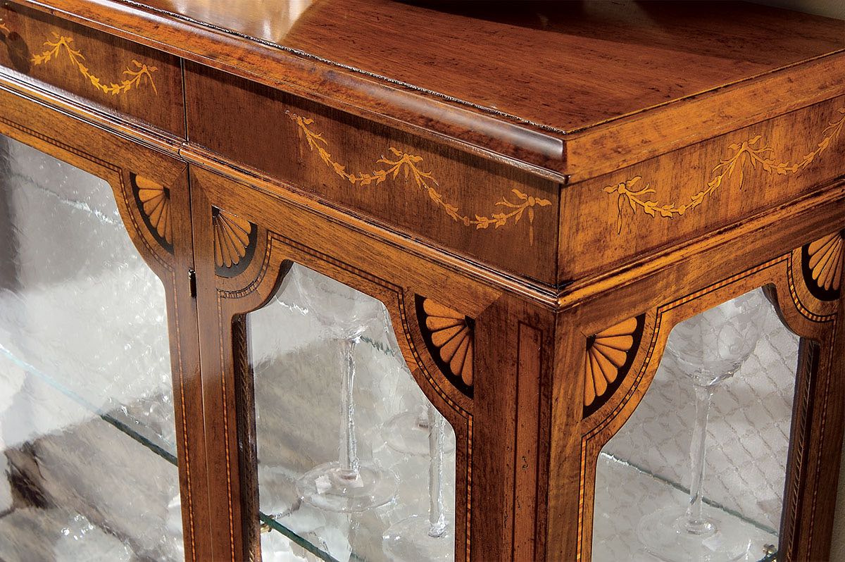 Vetrina intarsiata con vetri desag e cassetti segreti, stile inglese
